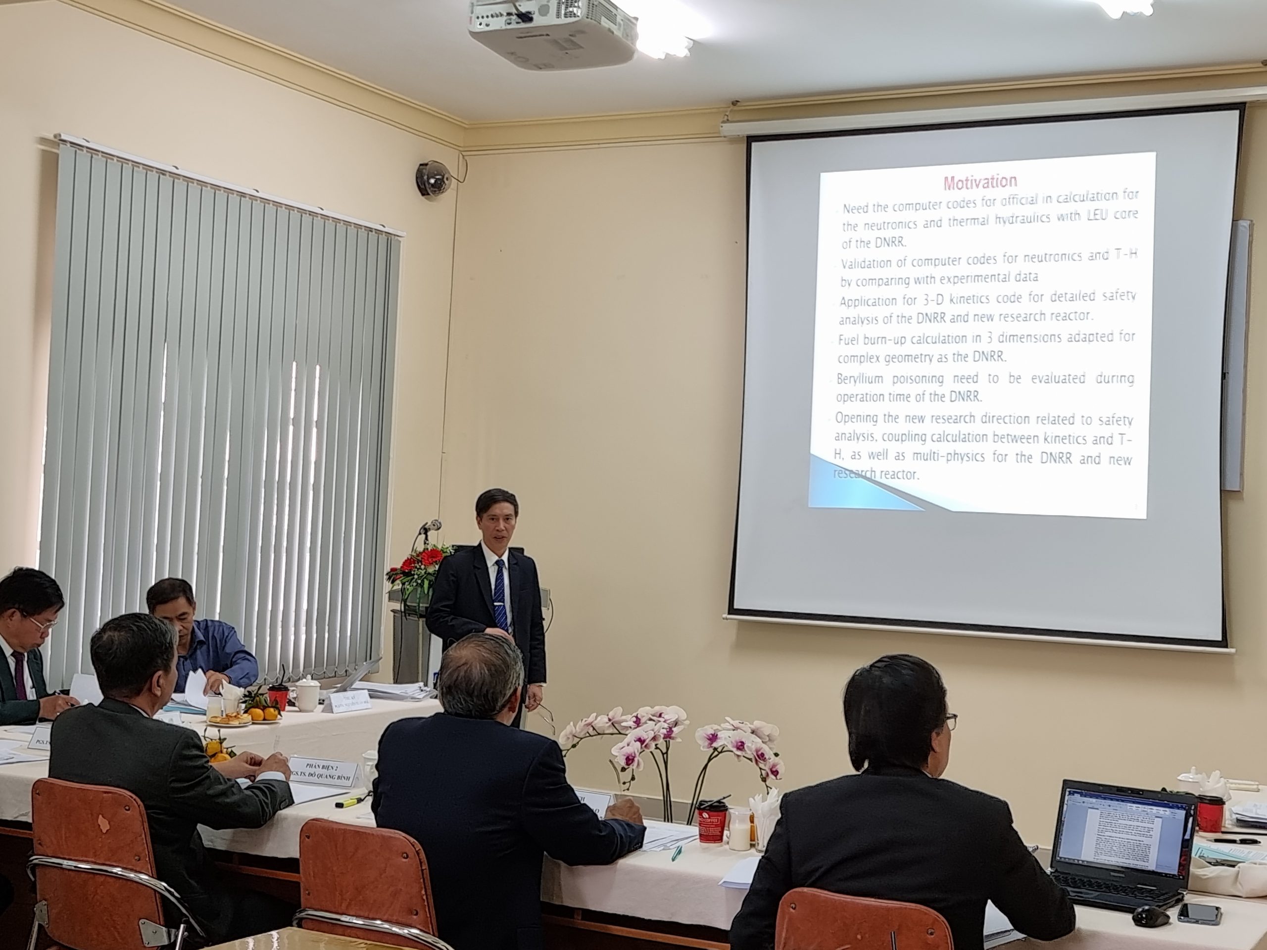 Đến tham dự buổi Lễ có TS. Cao Đông Vũ – Viện trưởng Viện Nghiên cứu hạt nhân, PGS.TS. Nguyễn Nhị Điền – người hướng dẫn khoa học cùng cán bộ của Trung tâm Lò, Trung tâm Đào tạo, nghiên cứu sinh đang theo học tại Đà Lạt và người thân của nghiên cứu sinh Nguyễn Kiên Cường. Dưới sự chủ trì của GS.TS. Châu Văn Tạo, Hội đồng đã thông qua lý lịch khoa học, thành tích nghiên cứu, quá trình học tập và kết quả nghiên cứu khoa học của NCS Nguyễn Kiên Cường trong những năm thực hiện đề tài, các thành viên Hội đồng đánh giá cao những kết quả nghiên cứu học tập và những nỗ lực của NCS trong thời gian qua.