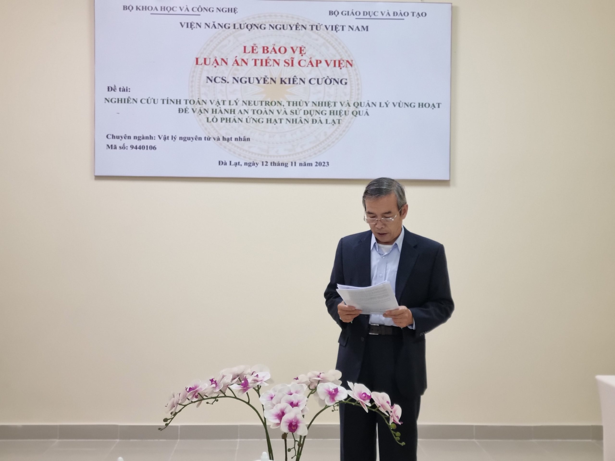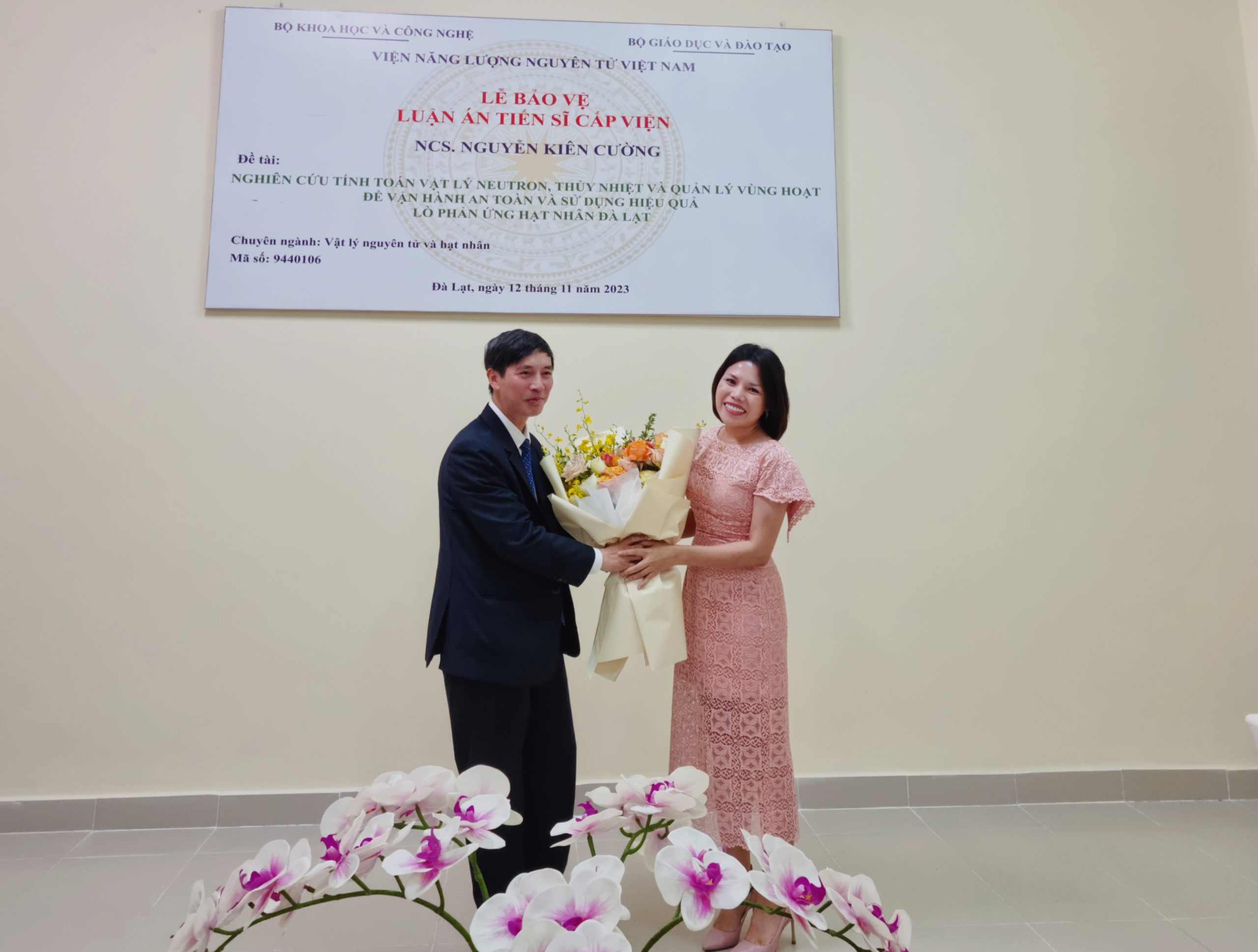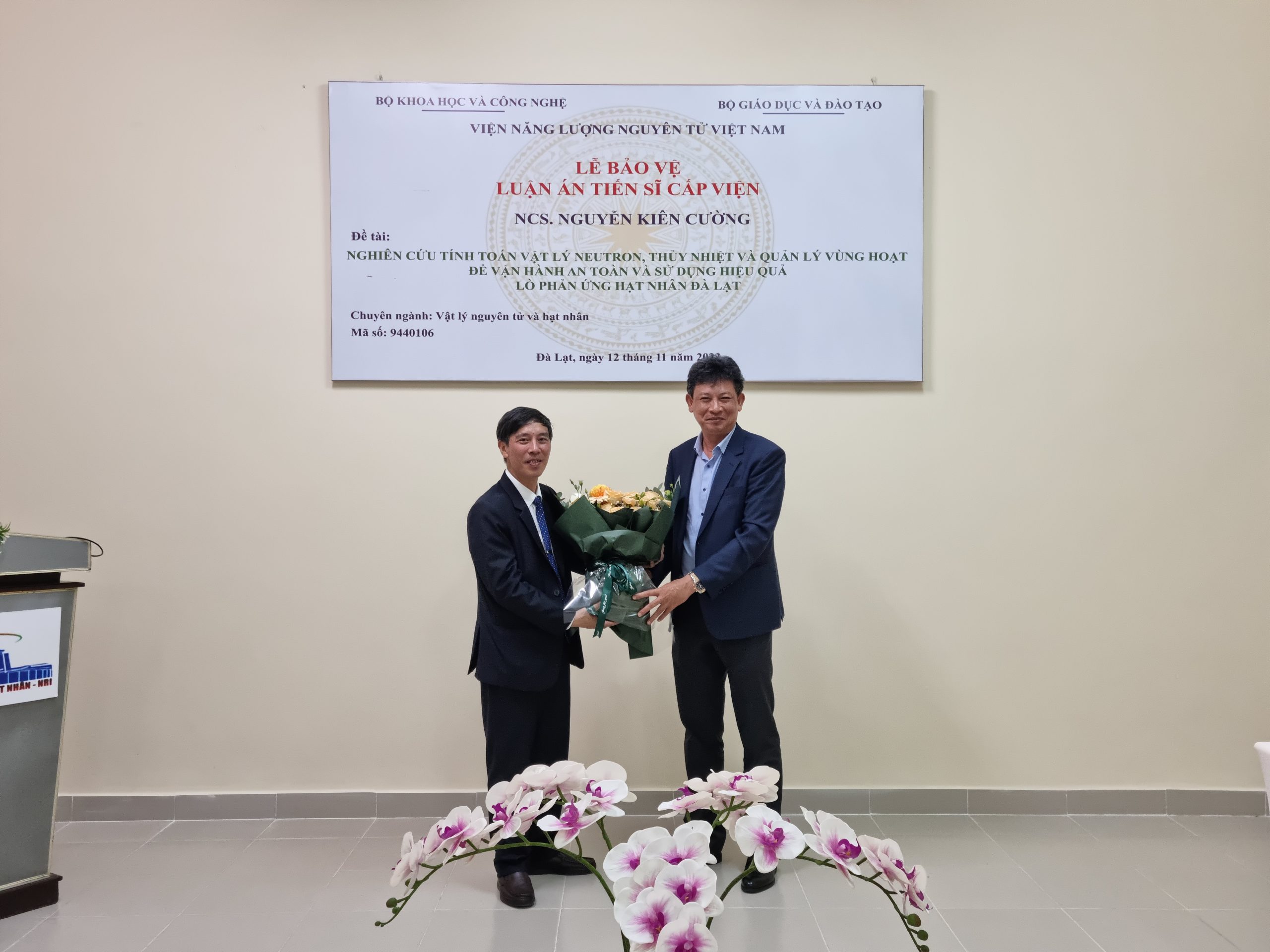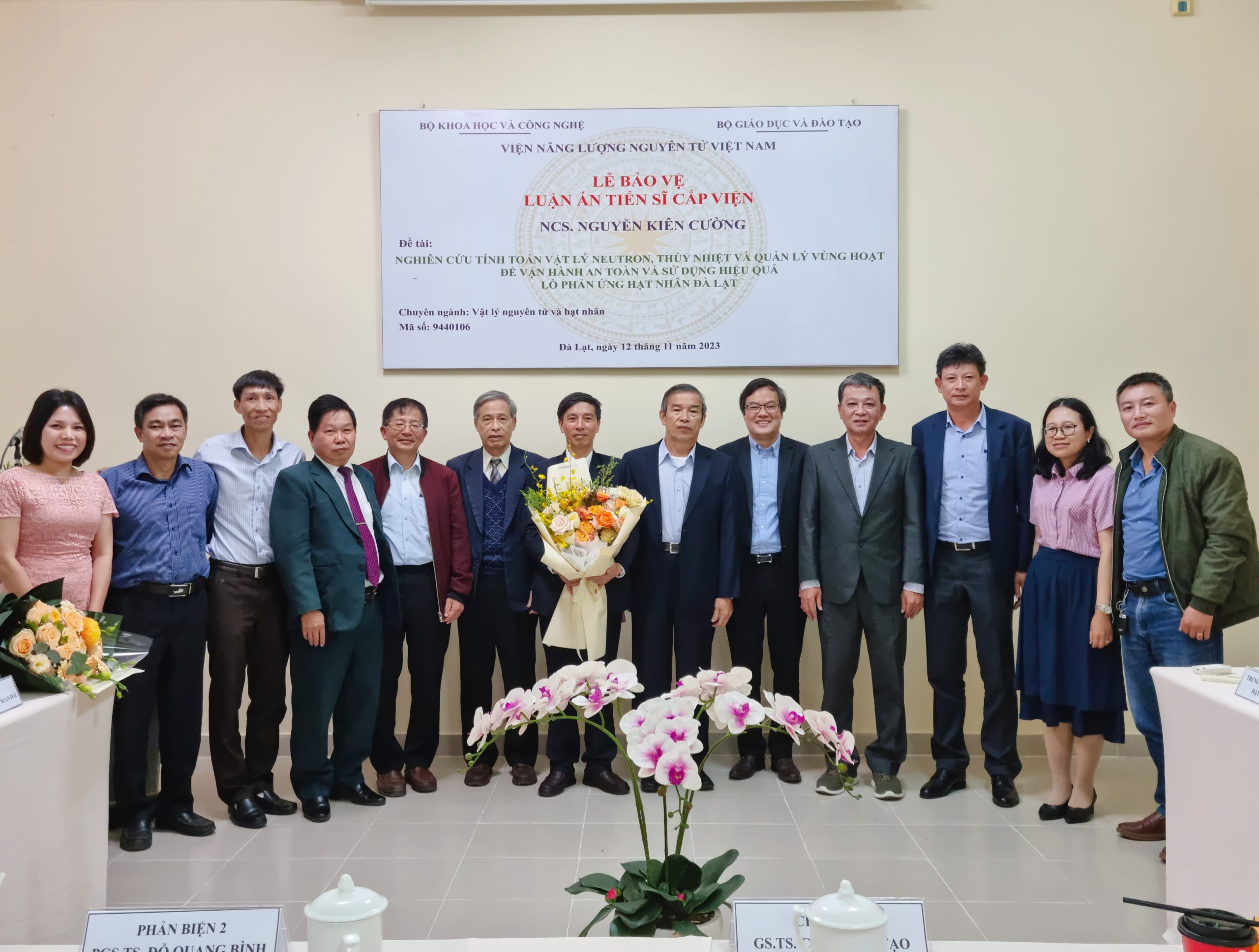 Ngày 12/11/2023, Trung tâm Đào tạo hạt nhân đã long trọng tổ chức Lễ bảo vệ luận án tiến sĩ cấp Viện cho nghiên cứu sinh Nguyễn Kiên Cường, chuyên ngành Vật lý nguyên tử và hạt nhân (mã số 9.44.01.06), đề tài luận án Nghiên cứu tính toán vật lý neutron, thủy nhiệt và quản lý vùng hoạt để vận hành an toàn và sử dụng hiệu quả lò phản ứng hạt nhân Đà Lạt với sự hướng dẫn khoa học của PGS.TS. Nguyễn Nhị Điền.
